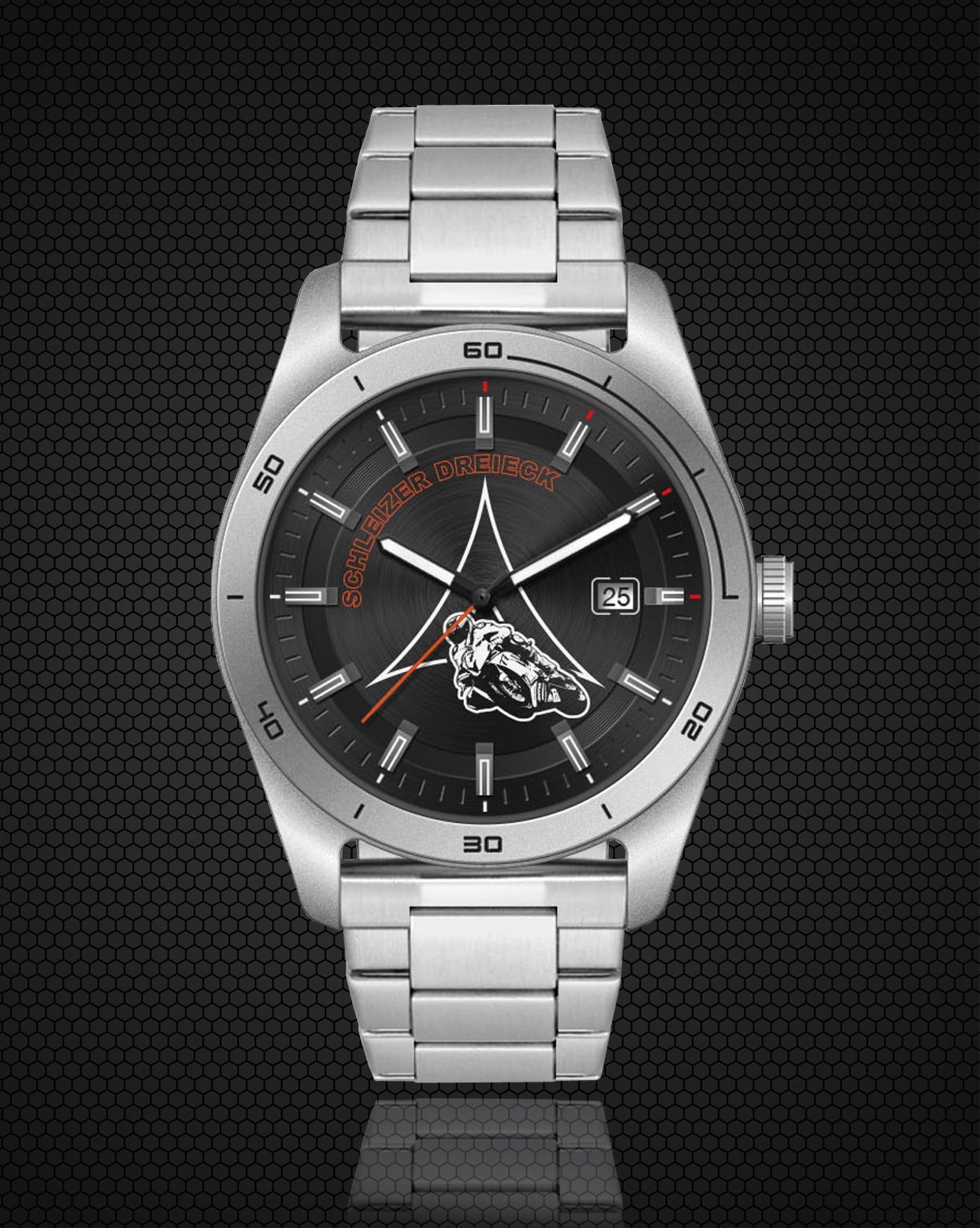 Gehäuse und Band massiv Stahl matt gebürstet, 42 mm, Bandschließe geprägt mit Dreiecklogo,